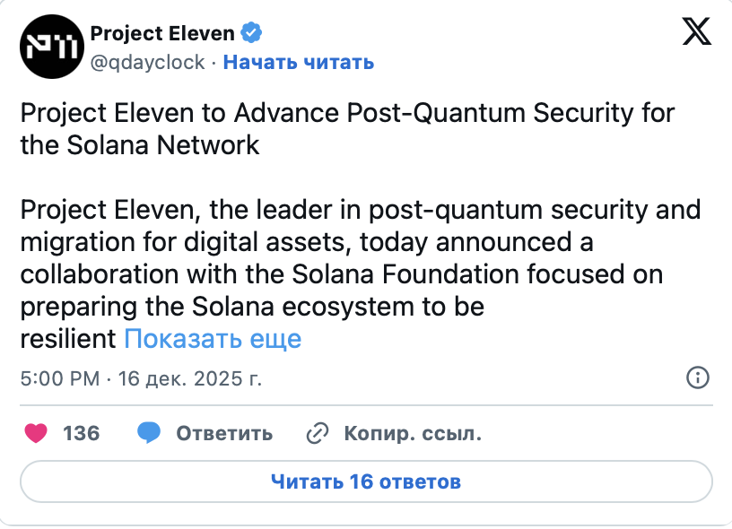 Project Eleven продолжит работу с Solana и другими участниками экосистемы. Сети оценивают пути миграции и новые стандарты. Также рассматривается внедрение постквантовых примитивов.