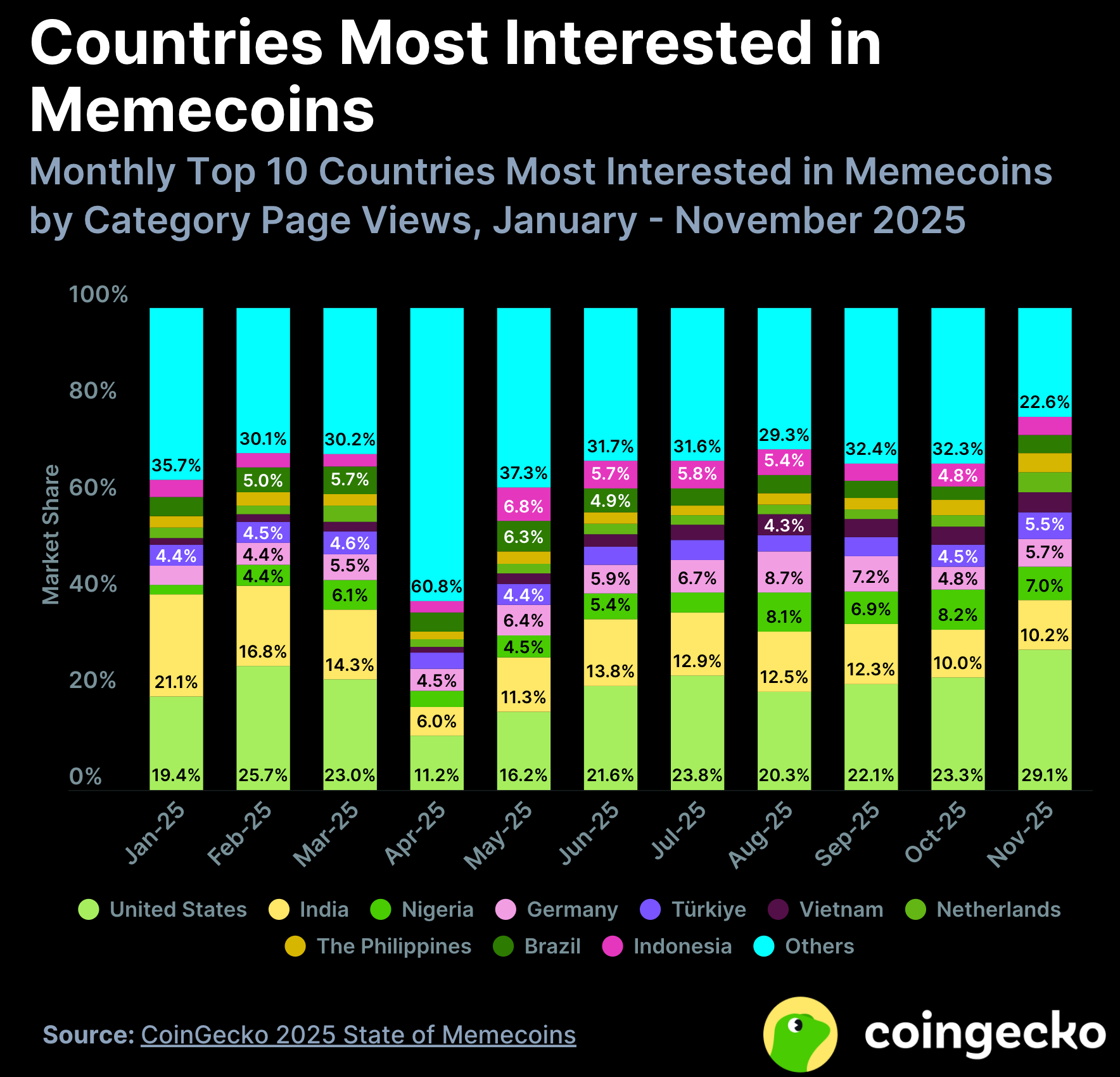 В географическом плане наибольший интерес наблюдался в США, на долю которых к ноябрю 2025 года приходилось около 30 % трафика, связанного с мемкоинами. Но даже там вовлечённость неуклонно снижалась в течение года, что говорит о том, что ясность в вопросах регулирования мало способствовала поддержанию спекулятивного интереса.