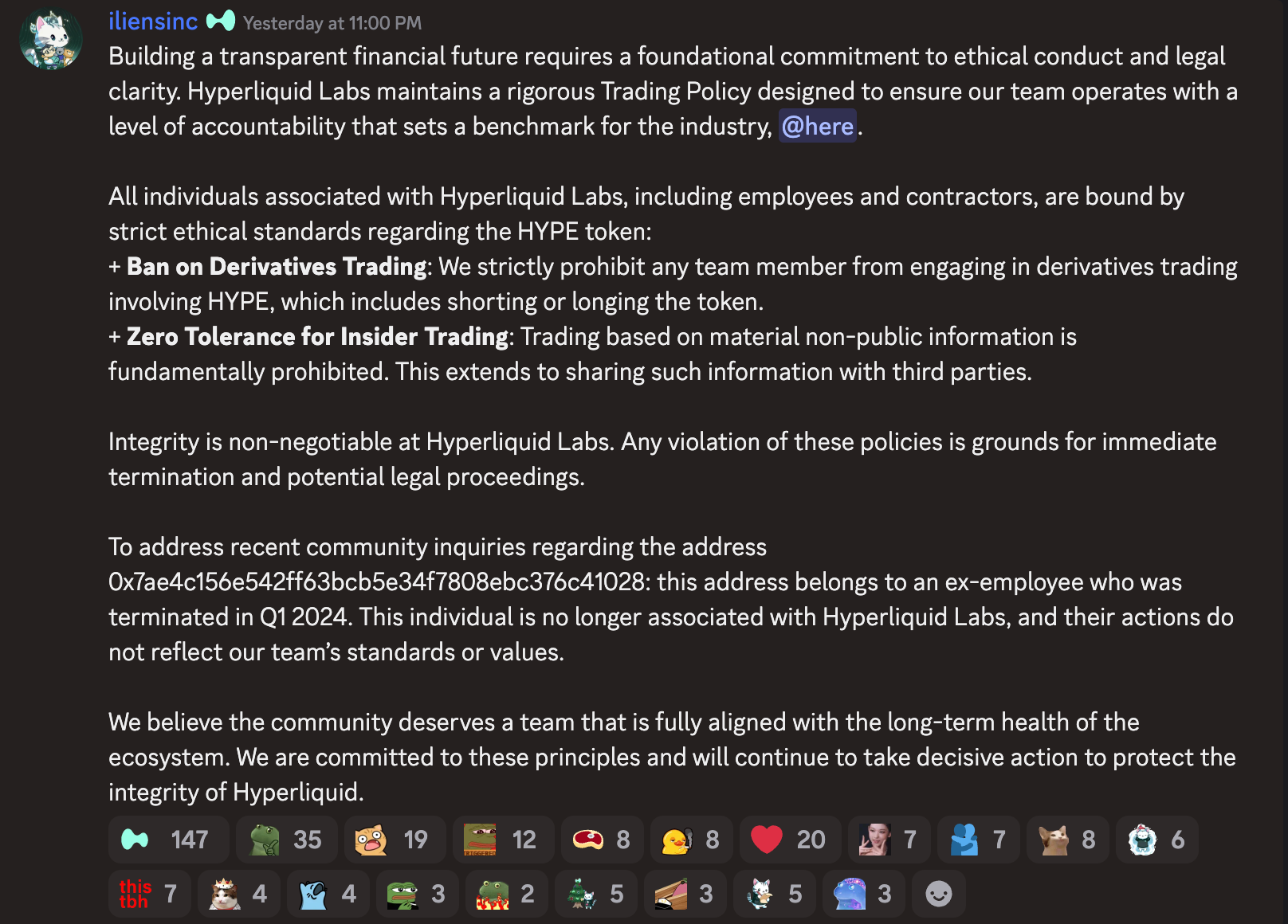 В сообщении в Discord Iliensinc указал, что Hyperliquid Labs придерживается строгой торговой политики. Она призвана гарантировать, что команда работает с «уровнем ответственности, который задает эталон для отрасли».