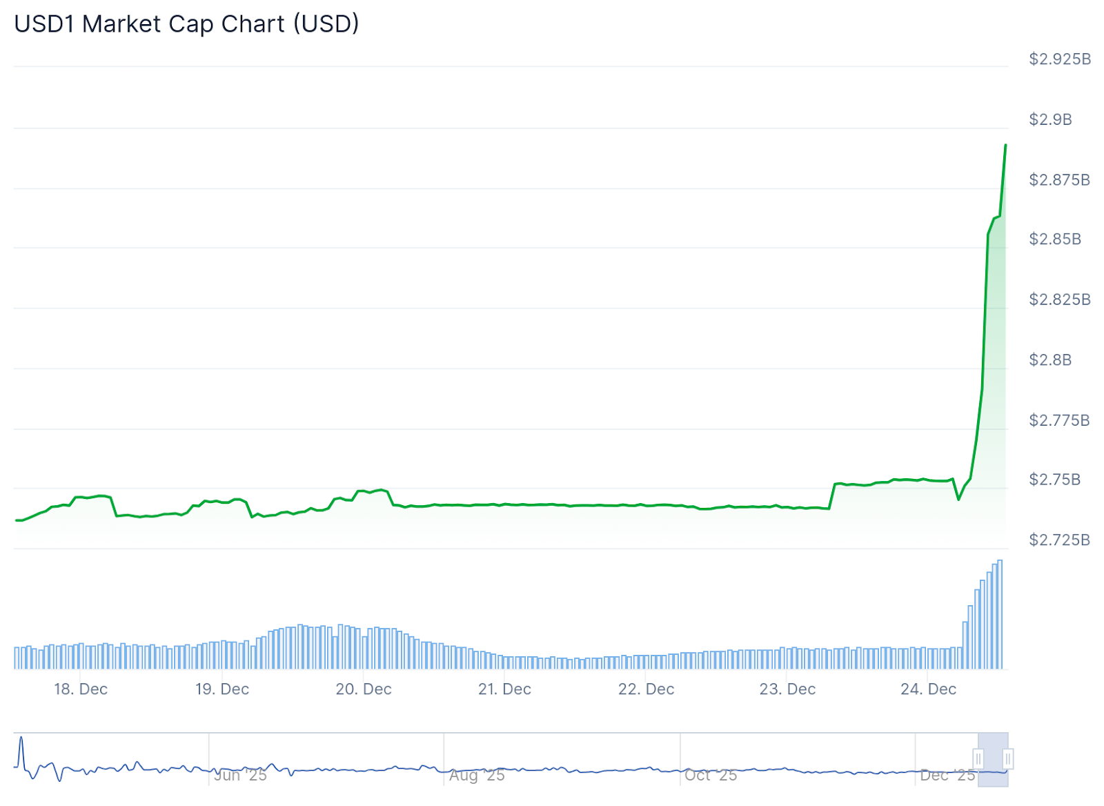 Рыночная капитализация стейблкоина выросла с $2,74 млрд до $2,89 млрд после того, как Binance представила свою «программу‑бустер». Она предлагает доходность до 20% годовых (APR) по гибким продуктам USD1 для депозитов свыше $50 000.