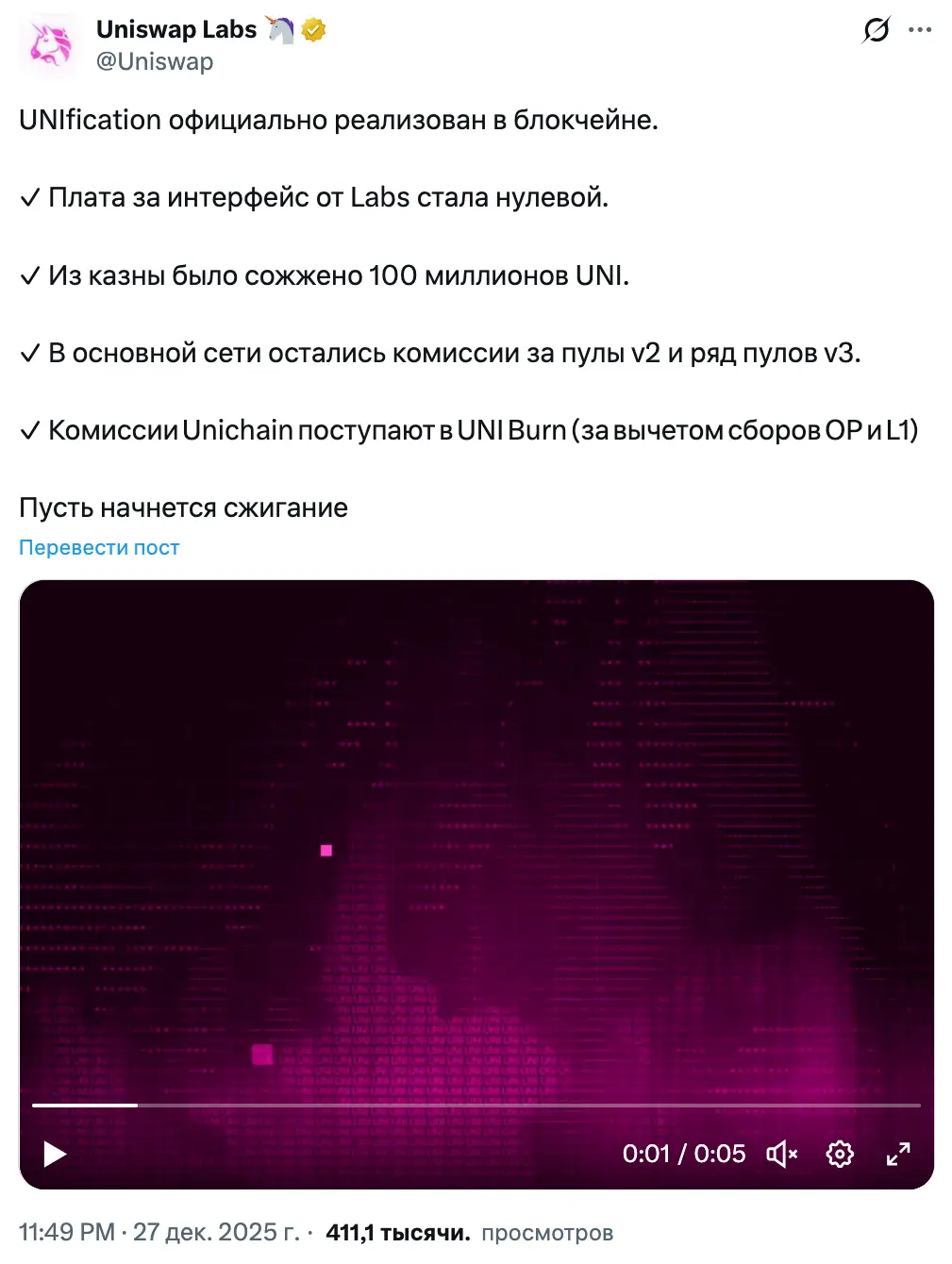 Uniswap Labs сообщила об исполнении решения в публикации на платформе X: «UNIfication официально реализован в блокчейне».