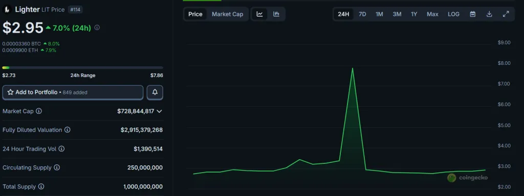 Торги токеном стартовали на отметке $2,73. Курс $LIT достигал $7,86, однако скорректировался до $2,95 (на момент написания).