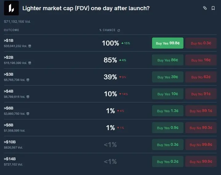 На платформе трейдеры поставили более $70 млн на то, какой будет полная оценочная стоимость (FDV) LIT через день после запуска.