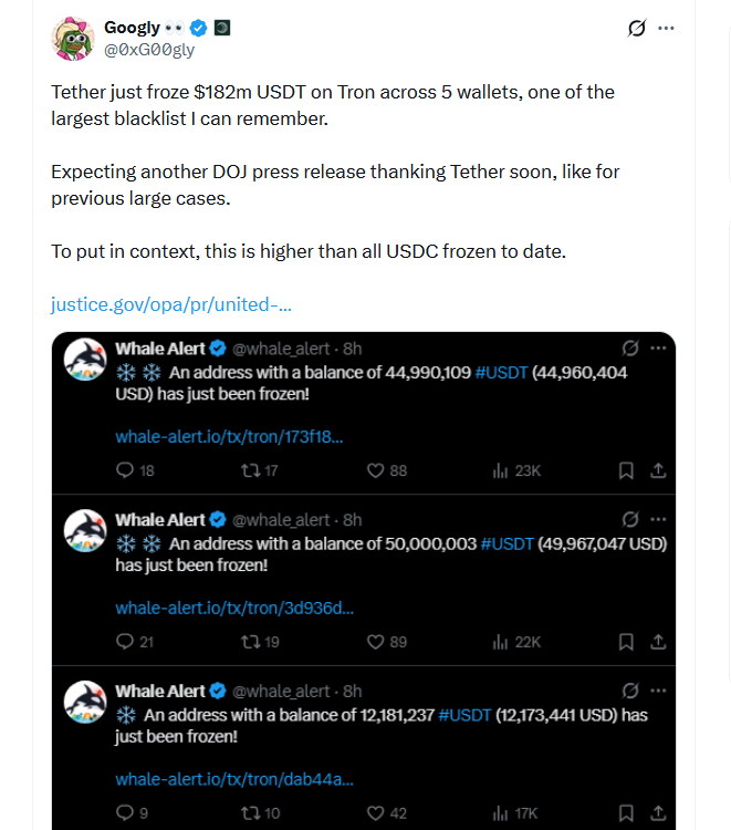 В минувшие выходные Tether нарастила указанную величину, заблокировав USDT на базе Tron на сумму в $182 млн на пяти адресах. Компания не уточнила, связаны ли они с Венесуэлой или Ираном.