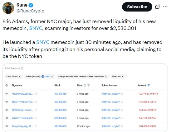 - Поддержанный Эриком Адамсом мемкоин NYC Token резко вырос в цене после запуска, но вскоре столкнулся с масштабным оттоком ликвидности.