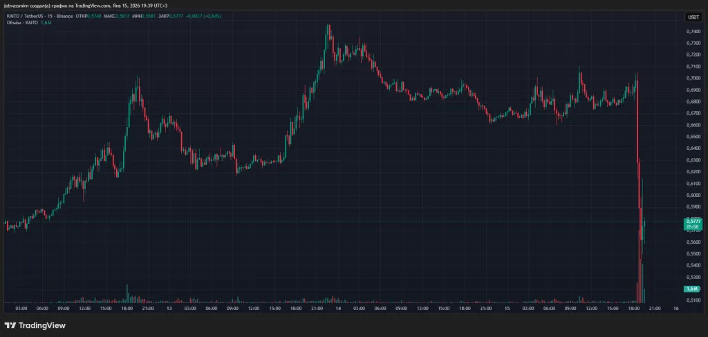 После анонса изменений нативный токен одной из самых популярных InfoFi-платформ Kaito (KAITO) обвалился почти на 20% — с $0,7 до $0,55.
