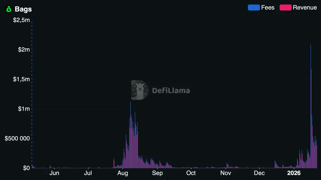 16 января объем комиссий за запуск токенов на платформе Bags превысил $2 млн, продемонстрировав тысячекратный рост относительно декабря.