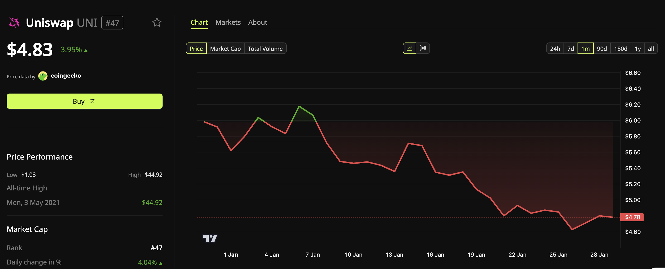Новость о регистрации траста не спровоцировала резких скачков стоимости актива. По данным мониторинга BeInCrypto Markets, токен $UNI торгуется на отметке $4.83. За последние сутки цена актива выросла почти на 4%, что коррелирует с общей рыночной динамикой.