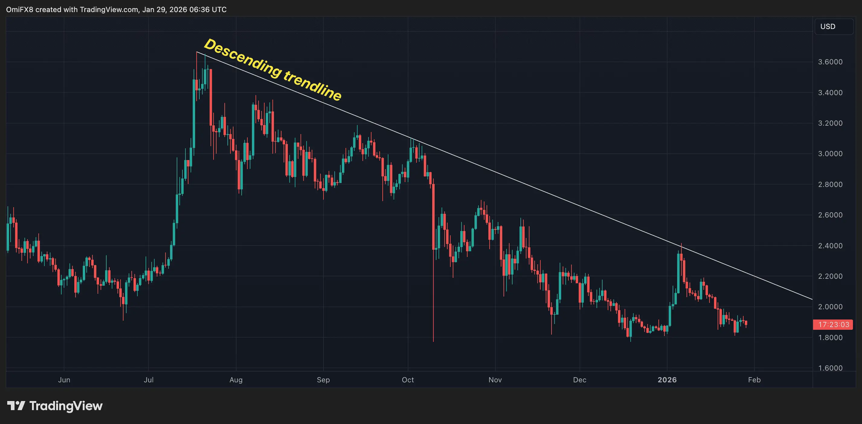 Тем не менее цена $XRP остается в рамках общего нисходящего тренда. Последняя торговая цена криптовалюты составила $1,88 — это на 1,7% ниже показателя суточной давности.