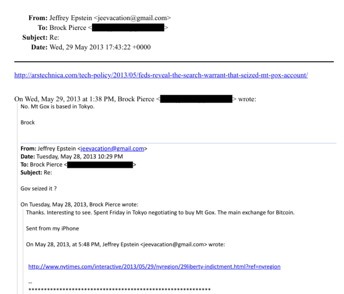 В переписке упоминаются рост цены биткоина, попытки приобрести биржу Mt. Gox и контакты с криптопредпринимателями, включая братьев Уинклвосс. Эпштейн проявлял интерес к инвестициям и просил помощи в установлении контактов в индустрии.