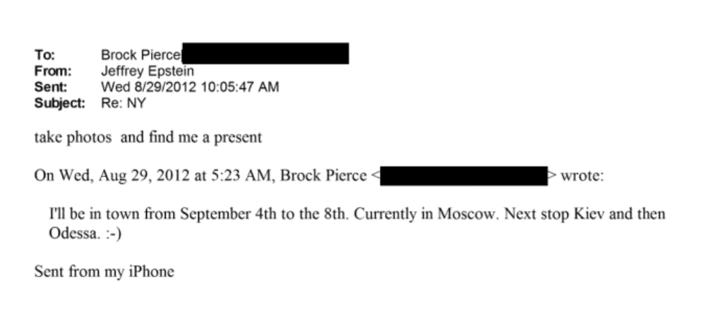 К примеру, в одном из писем за 2012 год Эпштейн попросил Пирса «сделать фотографии» во время поездки в Москву, Киев и Одессу, чтобы подобрать для него «подарок». В том же году Пирс поблагодарил финансиста за «прекрасное время, проведенное с девушками».