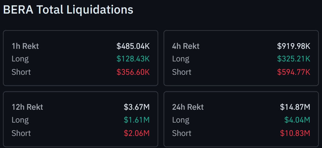По данным CoinGlass, на фоне волатильности сумма ликвидаций фьючерсных позиций в паре с $BERA составила почти $15 млн. Около $11 млн пришлось на шорт-позиции, остальное — на лонг.