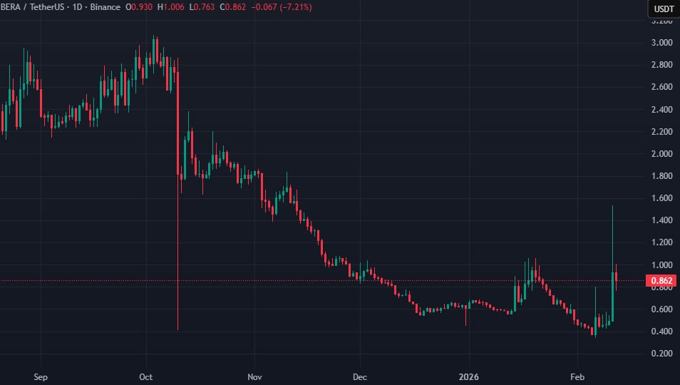 11 февраля 2026 года токен Berachain ($BERA) резко вырос в цене более чем на 200%. В моменте актив превысил отметку $1,5, однако затем откатился. На момент написания курс составляет около $0,86.
