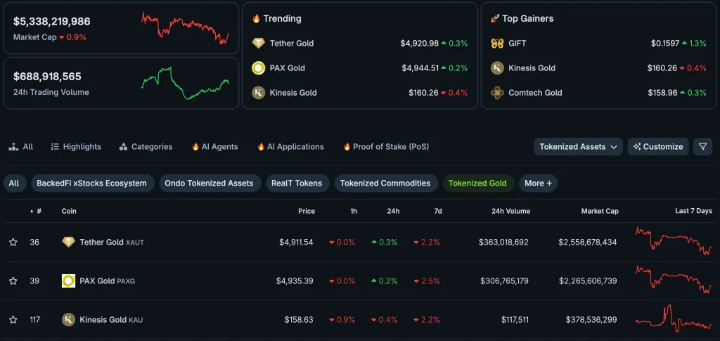 Сектор демонстрирует стремительный рост: общая капитализация превысила $5 млрд. XAUT удерживает лидерство как по объему торгов, так и по предложению.