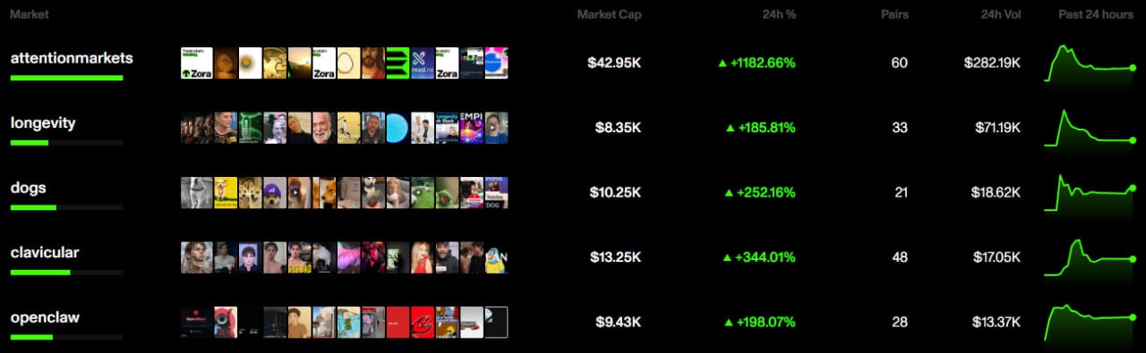 Отметим, на момент объявления в топ-5 популярных тем на платформе входят: attentionmarkets, longevity, dogs, clavicular, openclaw. За 24 часа они продемонстрировали рост на сотни процентов.