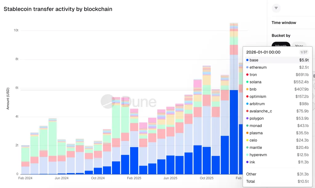 Наибольшая активность в январе зафиксирована на L2-решении Base. Сеть обработала переводы на $5,9 трлн. Через Ethereum и Tron прошло $2,5 трлн и $691 млрд соответственно.