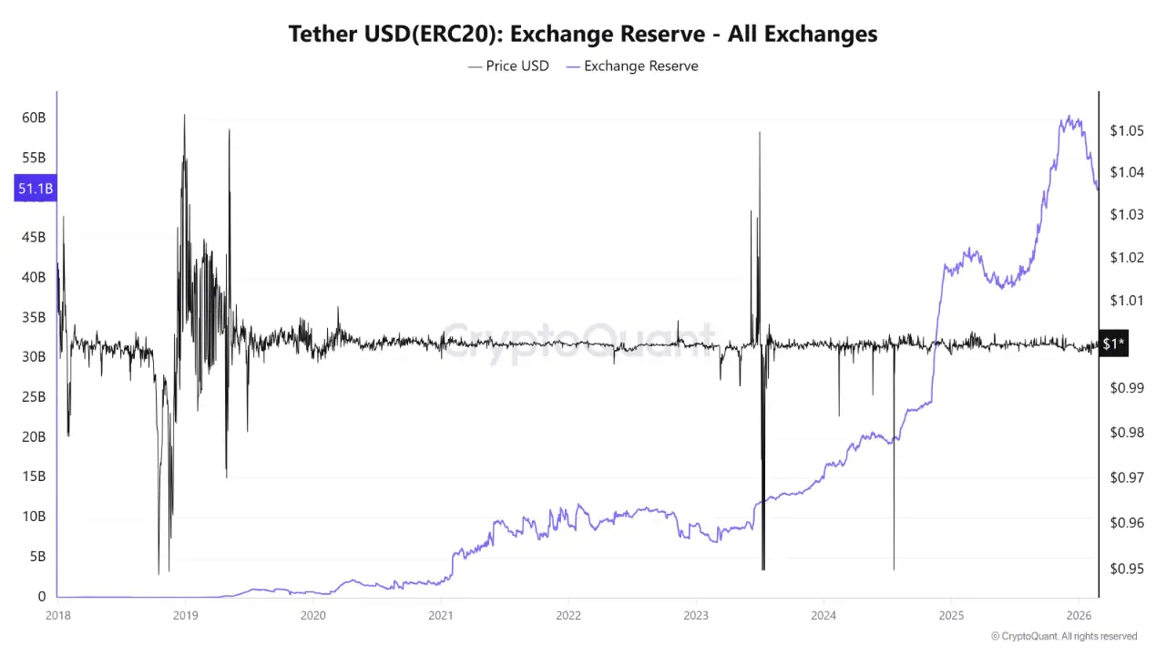 Крипторынок находится под давлением из-за оттока ликвидности, заявили в CryptoQuant. По оценке компании, за последние два месяца резервы стейблкоина $USDT на криптобиржах сократились с примерно $60 млрд до около $51,1 млрд. Общий отток составил около $9 млрд.