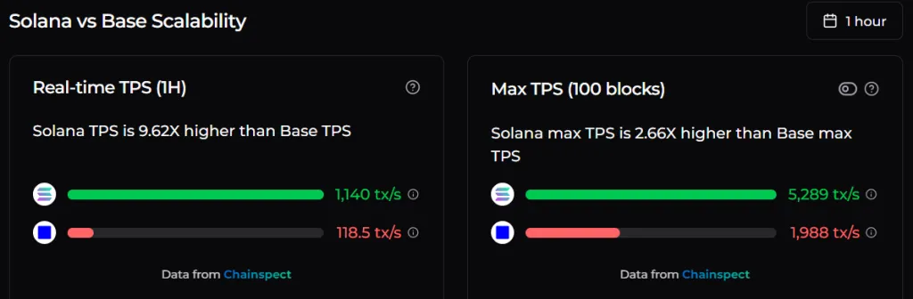 «Народная криптовалюта» значительно опережает Base по ключевым параметрам масштабируемости. Текущая пропускная способность «народной криптовалюты» составляет 1140 транзакций в секунду (TPS — это почти в 10 раз больше показателя Base (118,5 TPS). Исторический максимум Solana достиг 5289 TPS против 1988 TPS у конкурента. При этом теоретический предел Solana составляет 65 000 транзакций против 3571 у L2-сети.