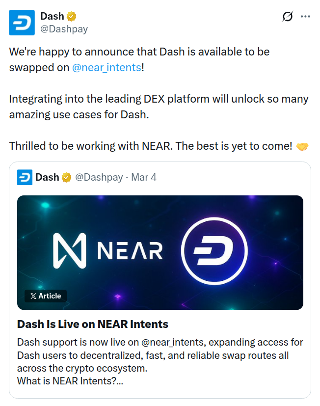 Через $NEAR Intents Dash уже можно обменивать более чем с 100 нативными активами, включая BTC, ETH, ZEC, SOL и основные стейблкоины в более чем 35 поддерживаемых сетях.