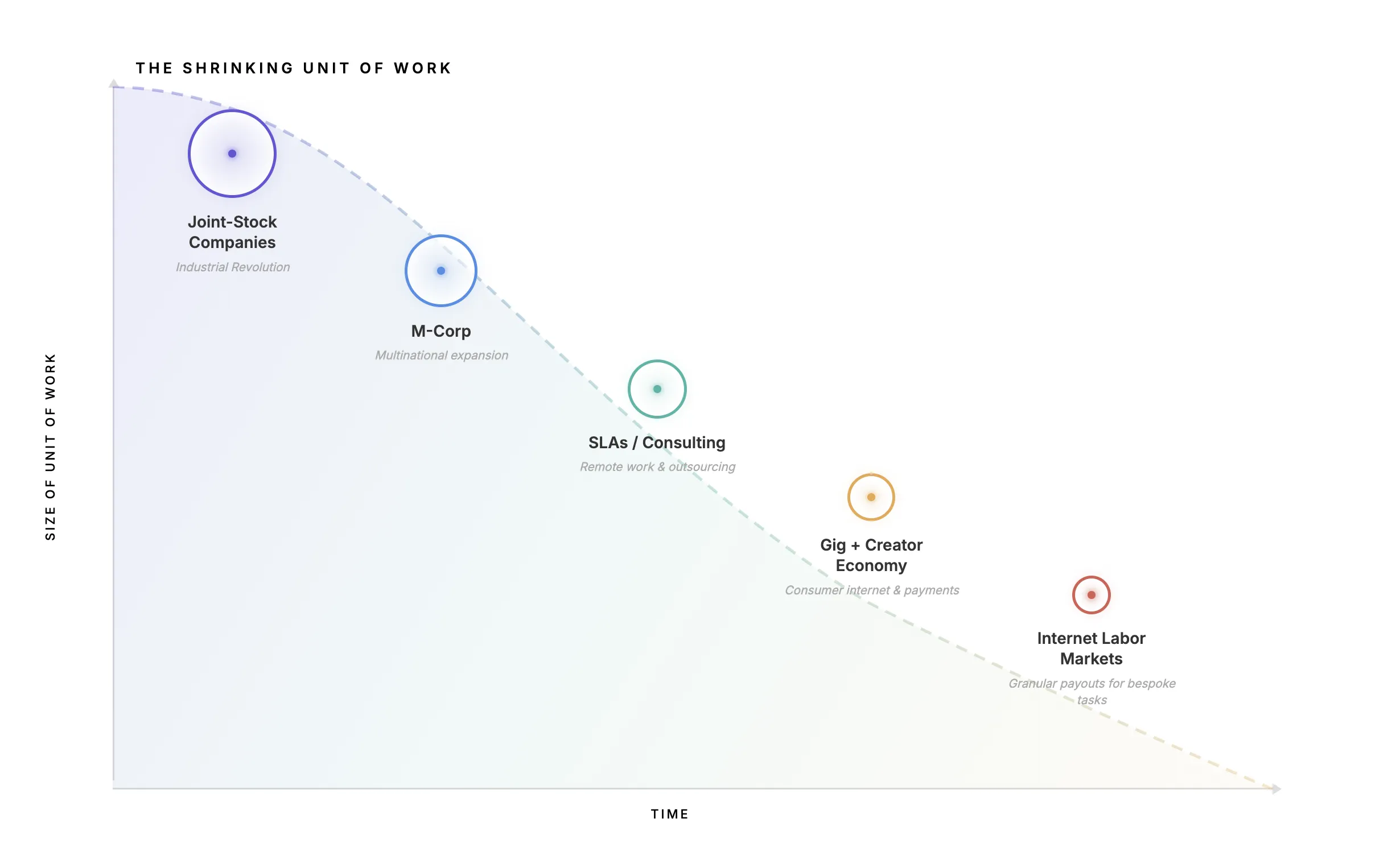 Организации будущего будут иметь крошечное ядро и огромную периферию исполнителей по запросу. Главное ограничение — не в найме, а скорости: как быстро можно найти нужного человека, убедиться в качестве его работы и оплатить результат. Здесь и нужны ILM.