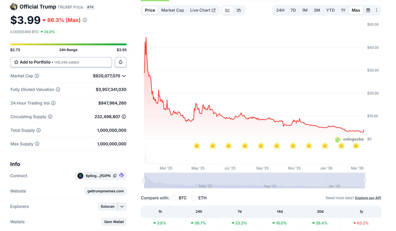 С вечера 12 марта на фоне новости $TRUMP подорожал более чем на 45% c рекордного минимума в $2,73. Монета все еще торгуется на 86,3% ниже своего исторического максимума ($73,43).