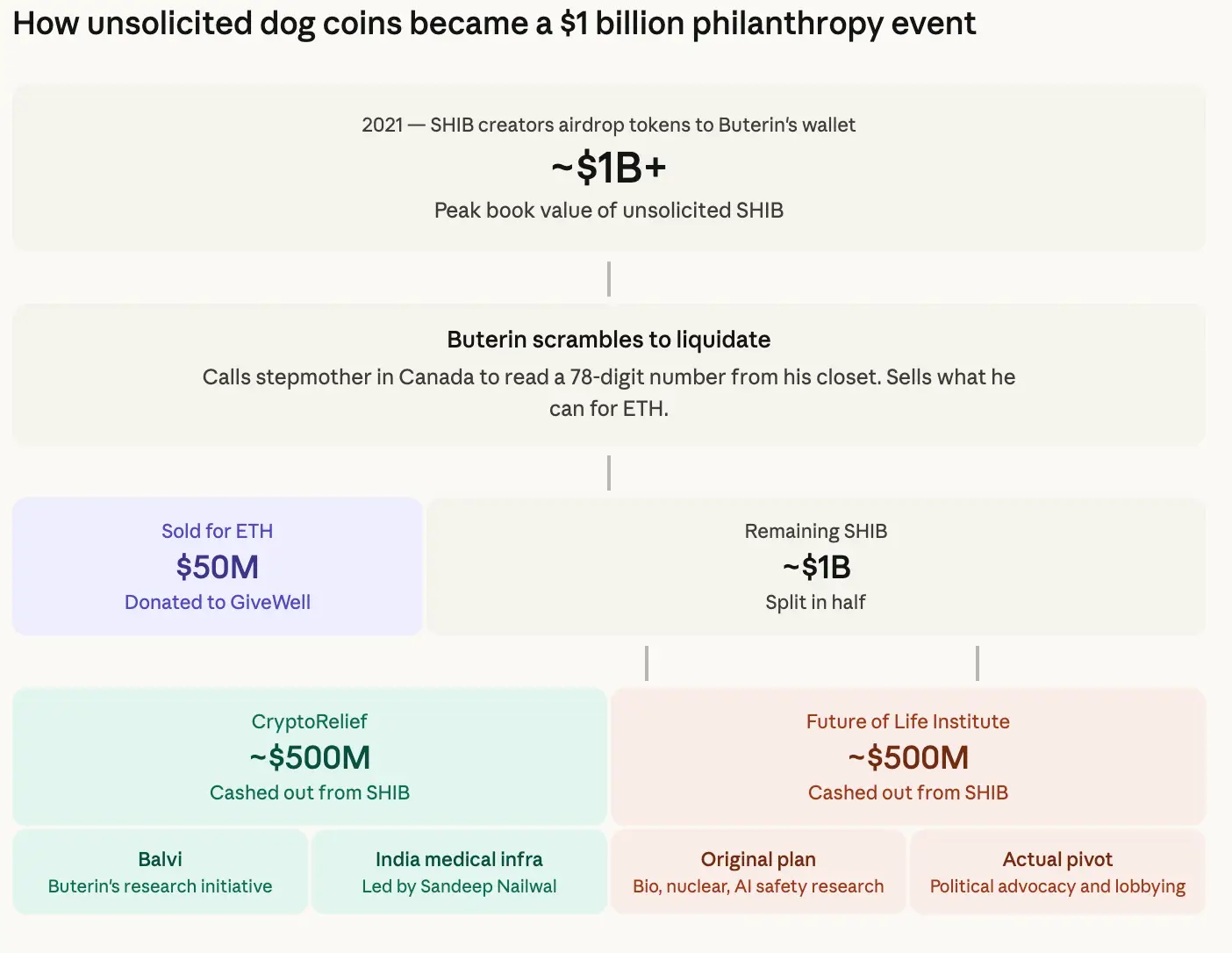 Бутерин рассчитывал, что Институт будущего жизни (Future of Life Institute, FLI) реализует $10–25 млн из его пожертвования 2021 года в виде мем‑токенов. Однако организация продала активы примерно на $500 млн и сменила фокус на политическую деятельность — Бутерин опасается, что это может привести к «авторитарным» последствиям.