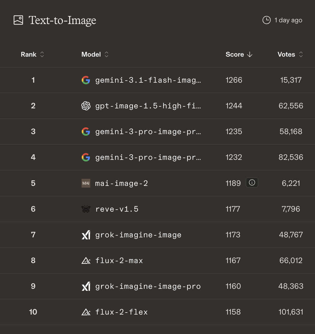 На практике модель действительно впечатляет в работе с естественным освещением, текстурами поверхностей и пространственными отношениями. Она занимает пятое место в рейтинге Arena.ai — Google сохраняет лидерство, — но разрыв оказывается меньше, чем ожидалось. Примечательно, что в ряде тестов MAI-Image-2 обходит GPT-Image по качеству картинки и точности текста, несмотря на то, что OpenAI занимает почетное второе место. Позиция в таблице не всегда отражает реальный результат.