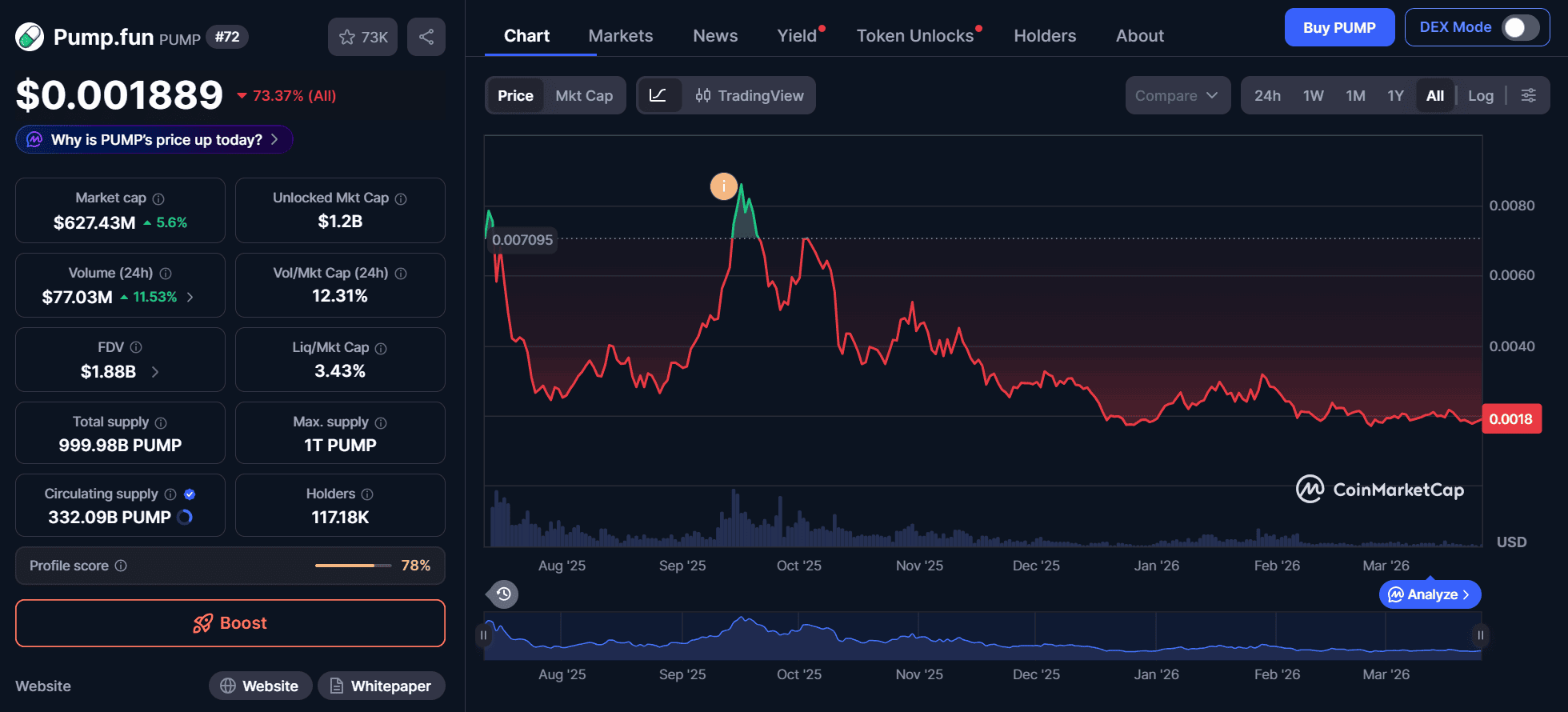 Ситуацию усугубляет падение цены токена pump.fun (PUMP) примерно на 73% от исторического максимума. На момент публикации материала актив торгуется по $0,0019, согласно CoinMarketCap.
