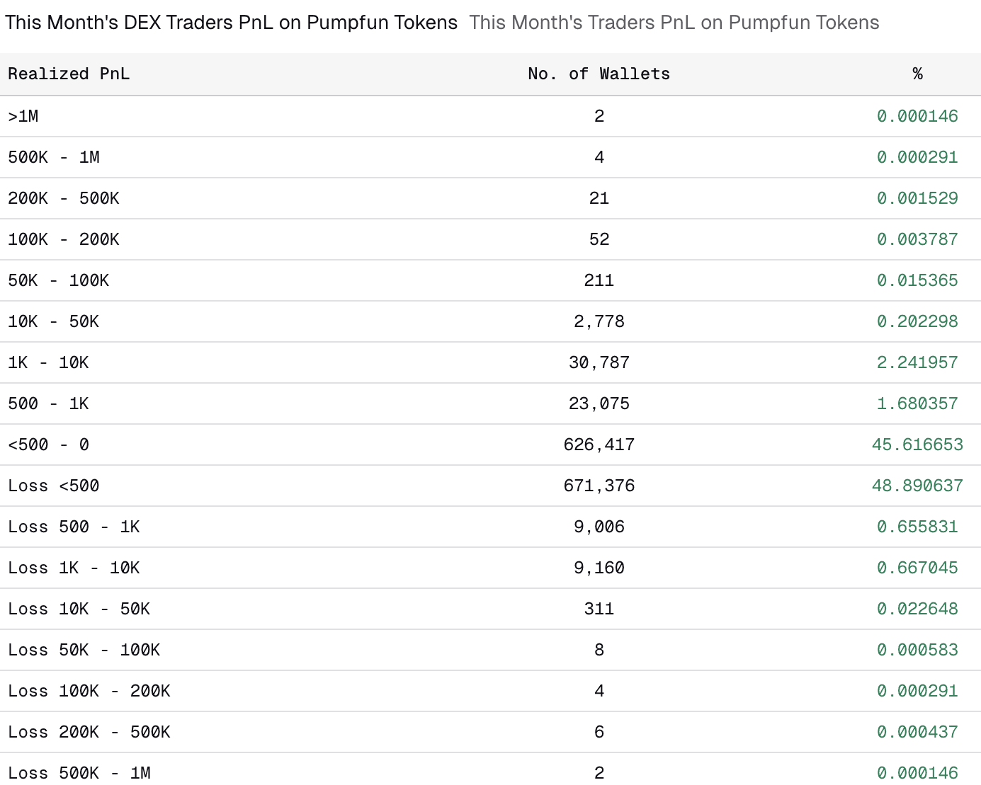 Более половины трейдеров, работающих с токенами pump.fun, понесли убытки в марте 2026 года. К таким выводам пришел пользователь Dune Analytics под ником oladee, проанализировав данные по активности кошельков.