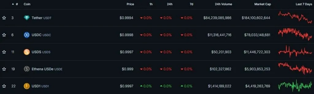 Флагманский токен от Tether доминирует в сегменте стейблкоинов совокупным объемом ~$310 млрд. Капитализация $USDT превышает $184 млрд.