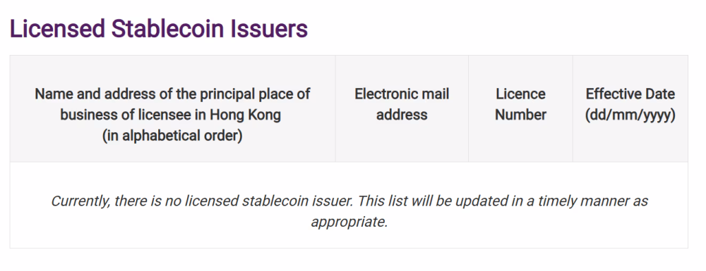 Реестр лицензированных эмитентов стейблкоинов Гонконгского управления денежно-кредитной политики по состоянию на 1 апреля 2026 года.
