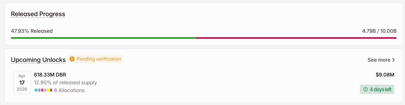 17 апреля проект выпустит 618,33 млн DBR на сумму около $9,08 млн. Это 12,9% от уже разблокированного предложения. Токены распределят между шестью категориями.
