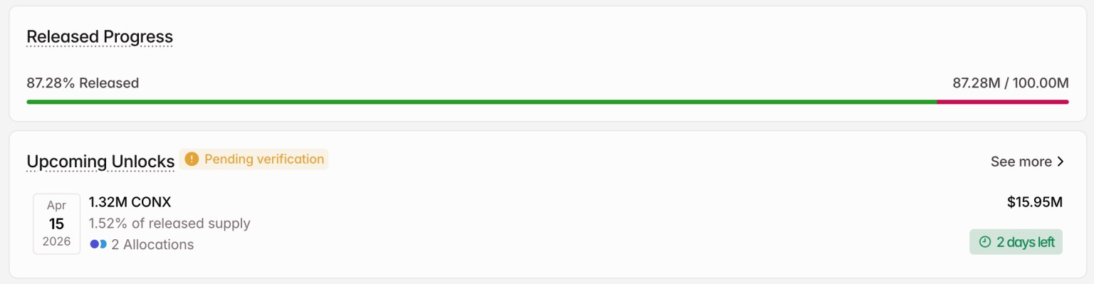 15 апреля в обращение поступит 1,32 млн CONX. По текущим оценкам, это около $15,95 млн. Объём составляет 1,52% от уже разблокированного предложения.