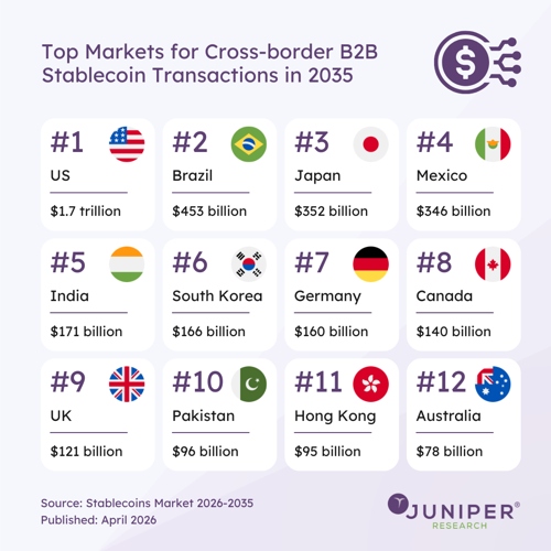 В документе указывается, что основной движущей силой внедрения стейблкоинов являются трансграничные бизнес-платежи. По оценкам Juniper, 85% от общего объёма транзакций с использованием стейблкоинов в 2035 году будет приходиться на B2B-сектор.