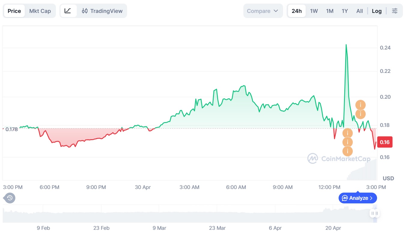 Актив дебютировал на ведущих биржах по цене в районе $0,2. По данным CoinMarketCap, на момент публикации токен торговался по $0.16.