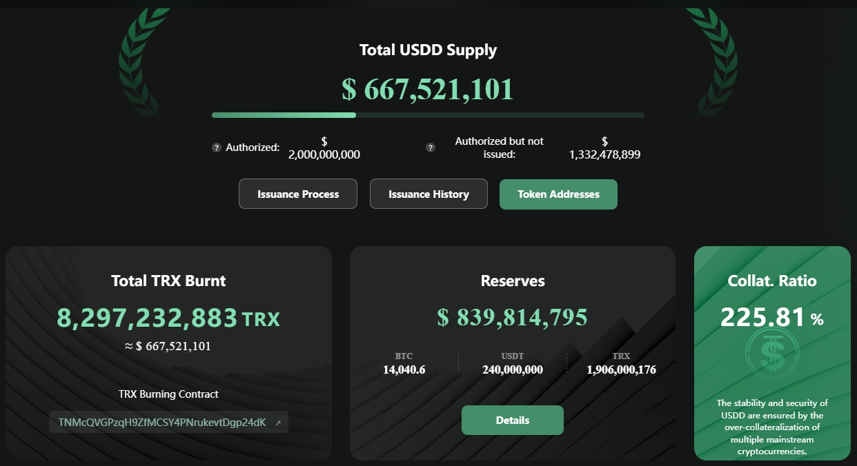 Согласно сайту, на момент написания в обращении находится 667,5 млн USDD, которые поддерживаются резервами в биткоине, USDT и TRX более чем на 225% стоимости.