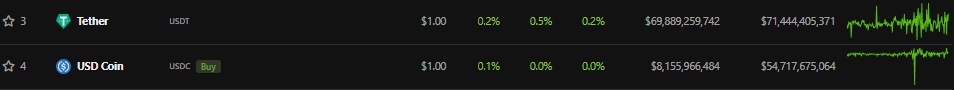 Согласно данным CoinGecko, капитализация ведущего стейблкоина составляет около $71,4 млрд. У второго по объему эмиссии USDC — $54,7 млрд.