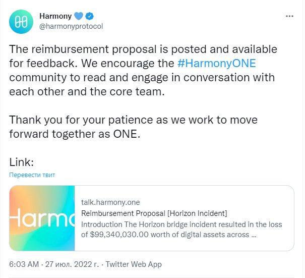 В Harmony сообщили, что текущее состояние их казны исключает немедленное возмещение средств. После кражи более 14 различных классов активов из 65 000 кошельков на сумму около $100 млн разработчики готовы выдать сообществу токены OP, которые будут выпущены после хардфорка.