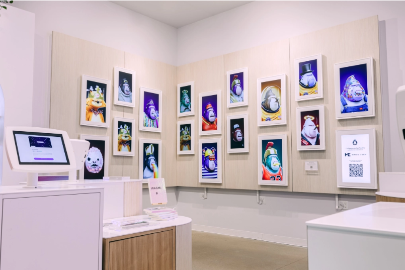 Рядом с кассой магазина Solana Spaces представлены изображения NFT из коллекции Degenerate Ape Academy. Посетители смогут оплатить покупки через платежную систему Solana Pay.