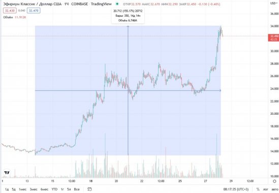 Курс ETC начал повышаться 13 июля, но покупатели не смогли пробить барьер сопротивления на отметке $ 28, и восходящая тенденция выдохлась. Второй виток бычьего тренда стартовал 26 июля. Благодаря стремительному росту объёма торгов цена монеты взлетела почти на 50% и 28 июля достигла максимального показателя за последние три месяца в $ 34 (на бирже Coinbase).