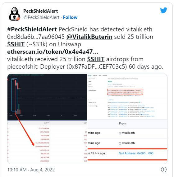 Судя по всему, Виталик получил 25 триллионов монет во время airdrop около двух месяцев назад. Эта распродажа спровоцировала обвал цены монеты на 57%.
