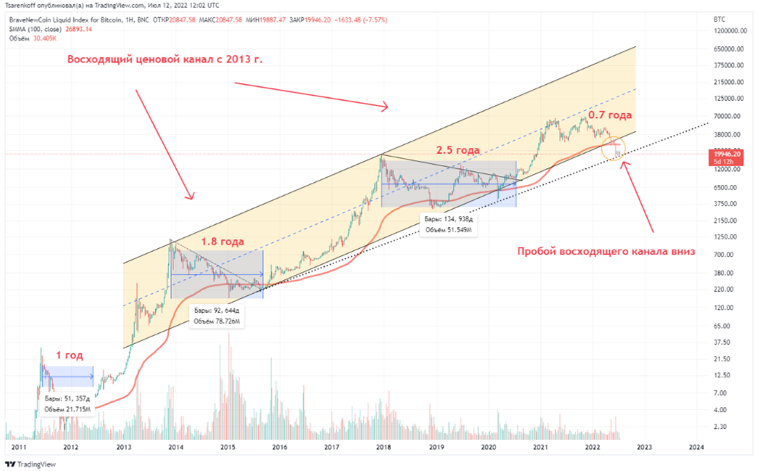 Это не означает, что мы продолжим падение к этой зоне с текущих ценовых значений и вообще не факт, что мы туда придем. Если текущий пятый цикл по времени будет коррелировать с предыдущими и продлится в районе 1500 дней, то медвежий часть текущего цикла может продлиться от 800 до 1100 дней, из которых более 200 дней уже позади, если началом медвежьего тренда считать 8 ноября 2021 года. То есть в итоге нас ждет затяжное падение, долгая консолидация и тотальное недоверие к рынку криптовалют. И это будет первая криптозима, которая будет проходить одновременно с серьезным экономическим кризисом во всем мире.”