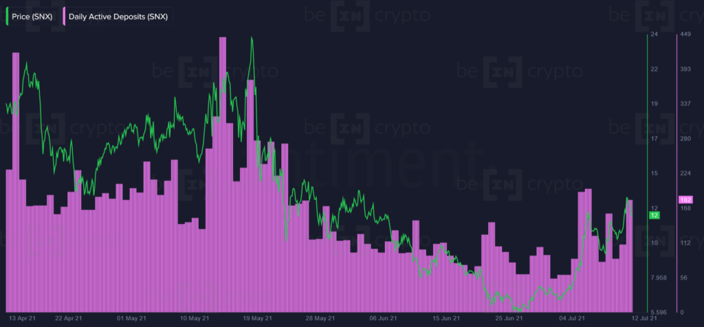 Эксперты предупреждают, что вместе с ростом активности адресов увеличился рост и депозитов SNX на централизованные биржи. Это может усилить давление со стороны продавцов, поскольку ходлеры SNX могут воспользоваться ралли для фиксирования прибыли, предупреждают в Santiment.