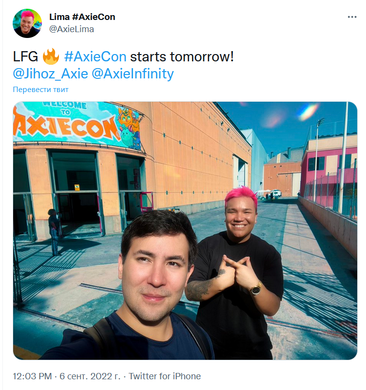 Создатель контента Axie infinity @AxieLima 6 сентября разместил в Twitter совместное фото с сооснователем Axie @Jihoz_Axie, напоминая, что уже завтра, 7 сентября в Барселоне стартует большое мероприятие AxieCon, которое продлится до 10 сентября.