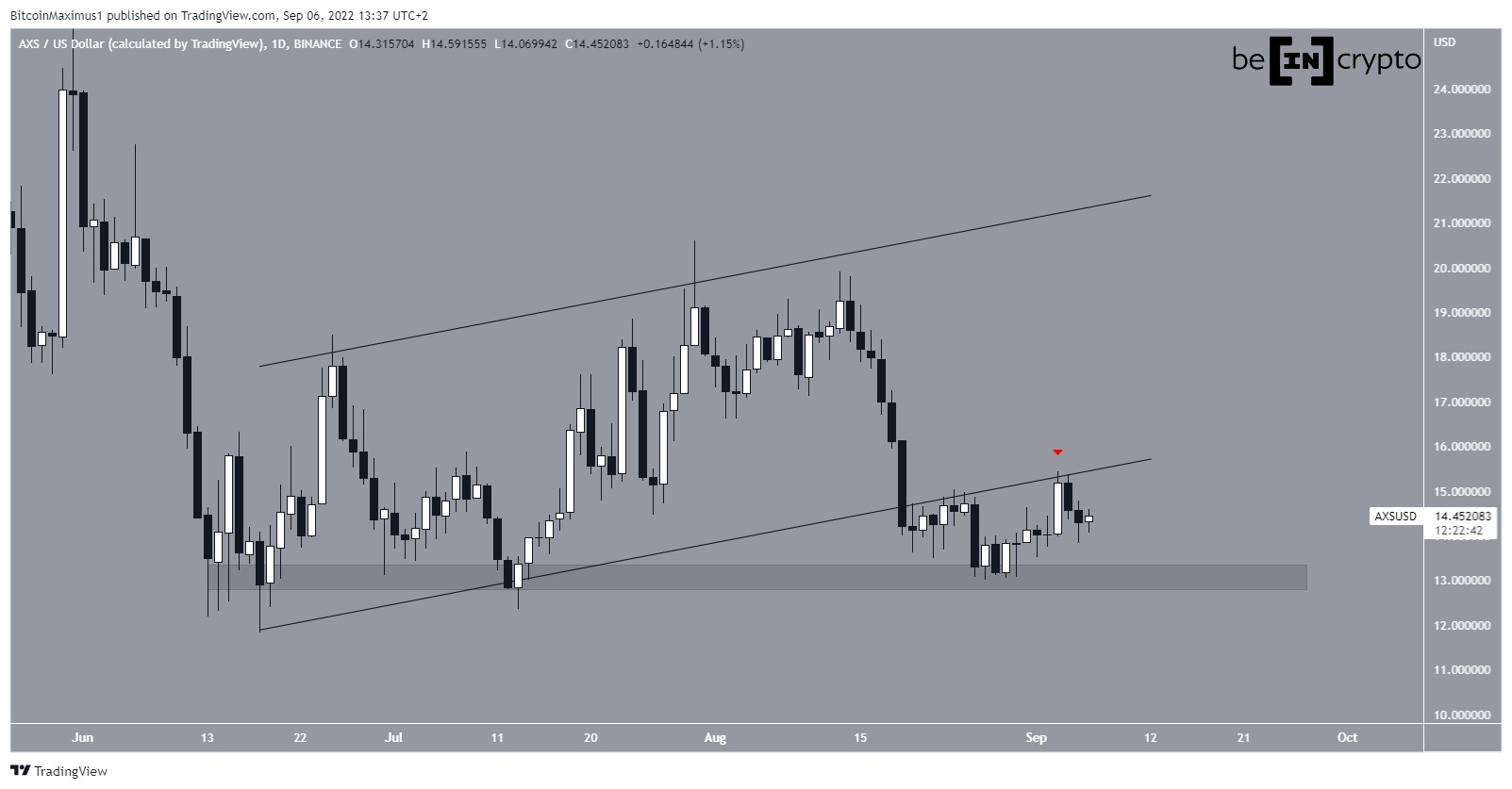Тем временем курс AXS с 18 июня рос внутри восходящего параллельного канала. В результате 30 июля цене удалось достичь максимума на $20.60. После этого коин начал сдавать позиции, а 19 августа совершил медвежий прорыв из канала.
