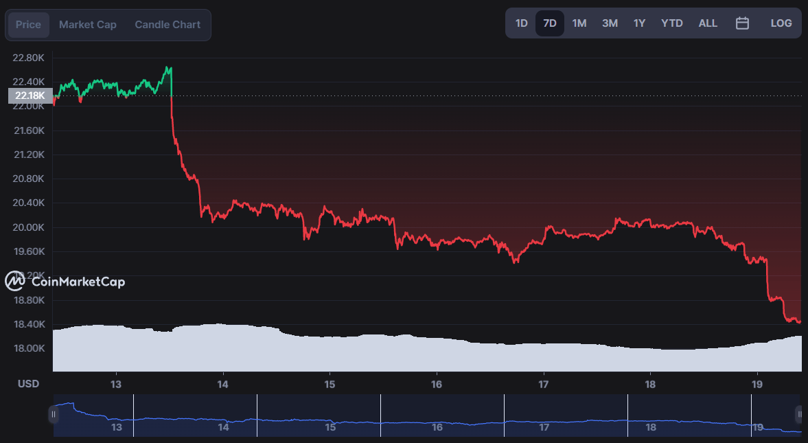 В настоящее время биткоин торгуется на уровне $ 18 716 с дневными потерями 5,9%, недельные отскок вниз составляет примерно 14%.