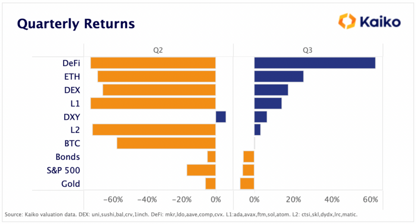 Инвестиции в криптовалюты по итогам III квартала окупились в разы больше, чем в драгметаллы или американские индексы. Об этом у себя в рассылке сообщают аналитики Kaiko.