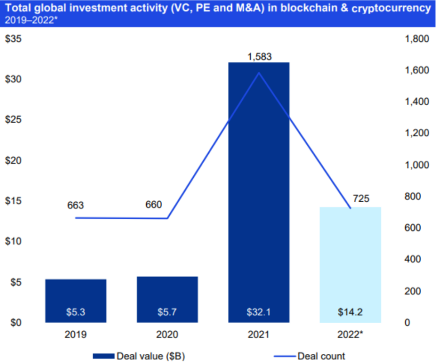 Согласно сентябрьскому отчету KPMG, в первой половине 2022 года венчурные фонды инвестировали в криптовалюты $14,2 млрд в рамках 725 сделок. И хотя эта цифра может показаться большой, приведенный ниже график говорит о другом.
