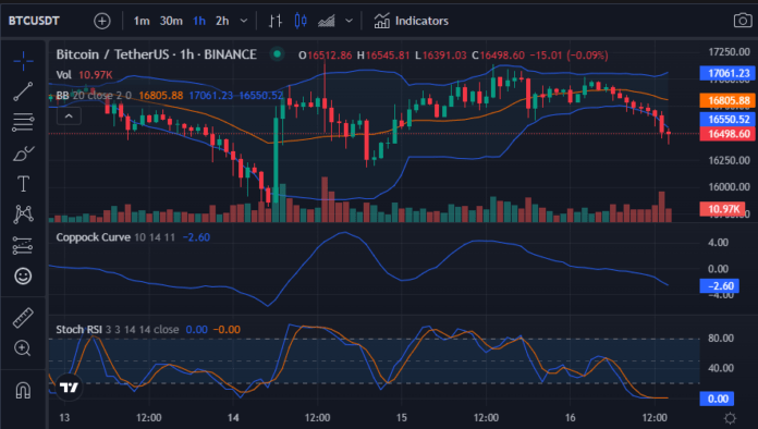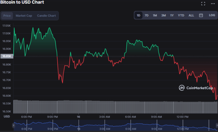 Биткоин (BTC) демонстрирует двойственную рыночную тенденцию, поскольку медведи и быки соревнуются за контроль над рынком. Однако за последние часы быки снова были повержены, так как цена BTC снизилась на 1,7% до $ 16 596.