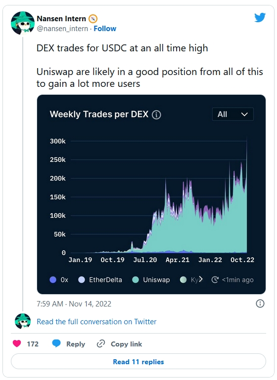 В последующие дни количество сделок со стейблкоином USDC на децентрализованных биржах (DEX) достигло исторически максимальных значений. «Похоже, происходящее [с FTX] дало Uniswap удачный момент для привлечения новых пользователей», – написал в Twitter представитель аналитического сервиса Nansen, комментируя рекордные показатели.